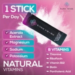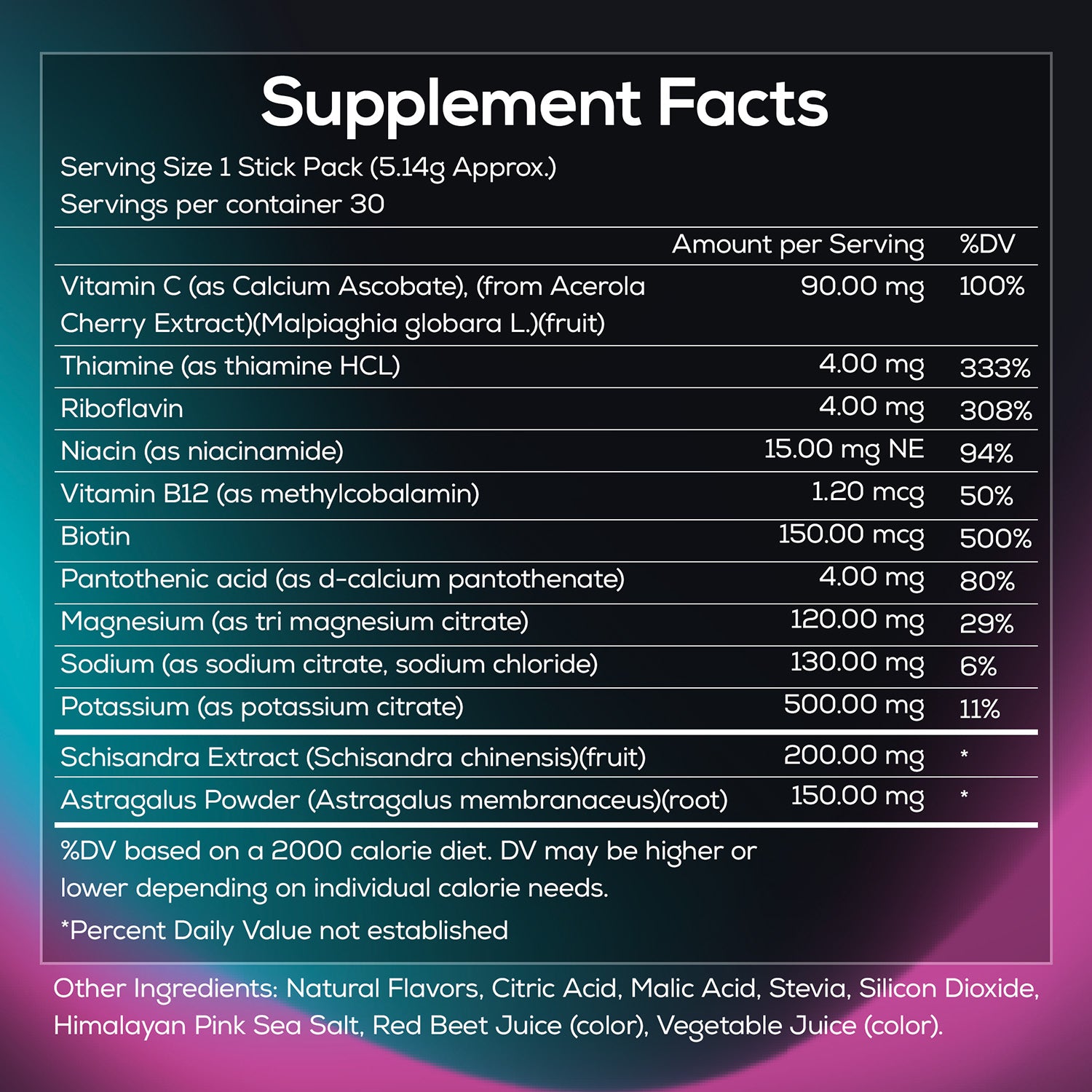 Vitamin C, Thiamin, Riboflavin, Niacin, Vitamin B12, Biotin, Pantothenic Acid, Magnesium, Zinc, Sodium, Potassium, Schisandra Extract, Astragalus Extract, Acerola Extract, Trace Minerals, Bamboo Shoot Extract, Citric Acid, DL-Malic Acid, Ancient Sea Salt, Natural Flavors, Silica, Stevia Extract, Reb M, Fruit & Vegetable Juice Powder (color), β-Carotene (natural color).