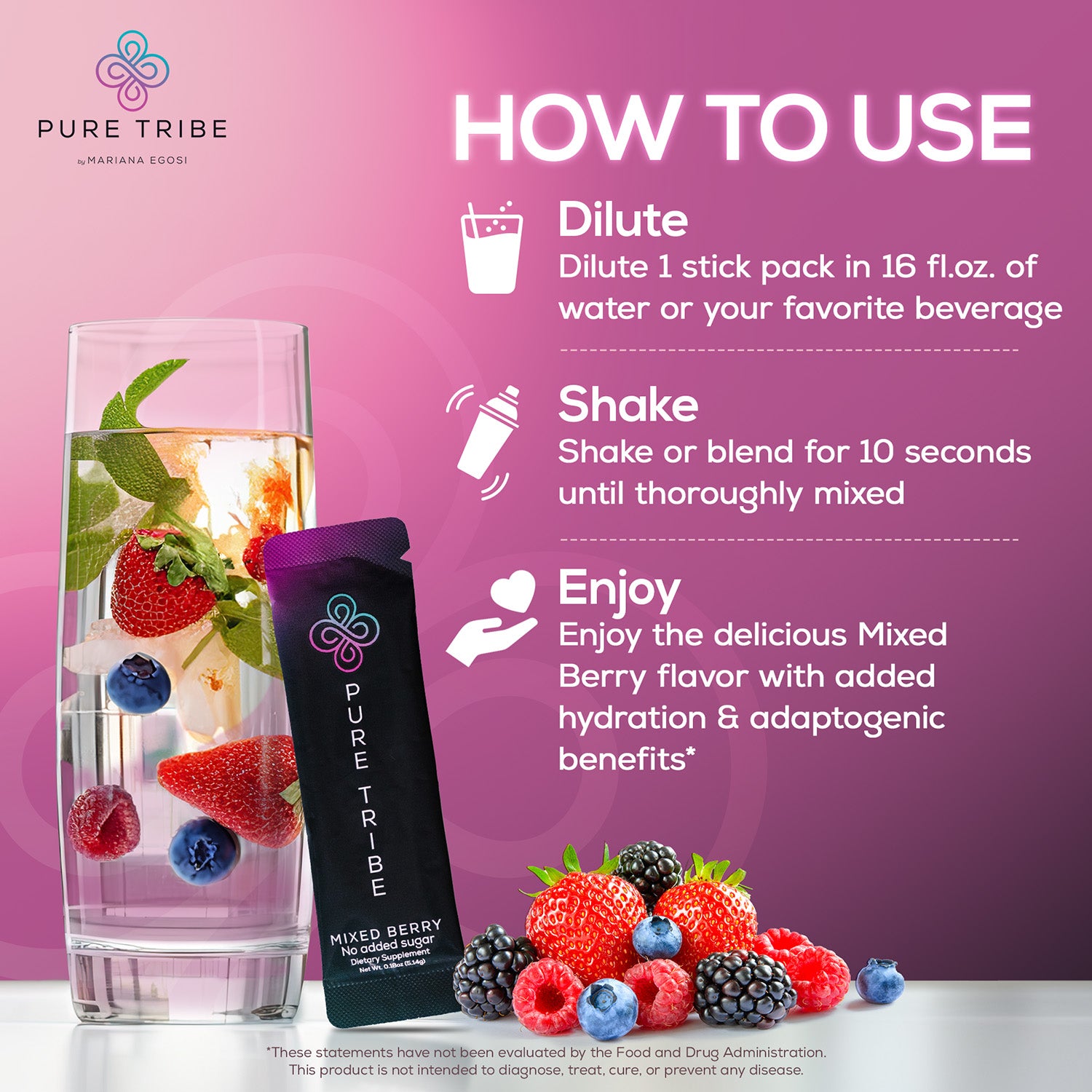 Simply dissolve one sachet in ½ liter of water or your favorite beverage. Enjoy the refreshing flavors of Mixed Berry, Passion Fruit, Coconut Lime, and Tangerine, while benefiting from enhanced hydration and adaptogenic support.