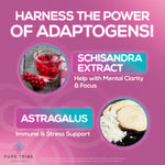 Our unique formula goes beyond ordinary hydration, featuring adaptogenic herbal extracts like Astragalus Root and Schisandra, known for their stress-reducing and balancing properties. Stay calm, focused, and ready for whatever the day brings!