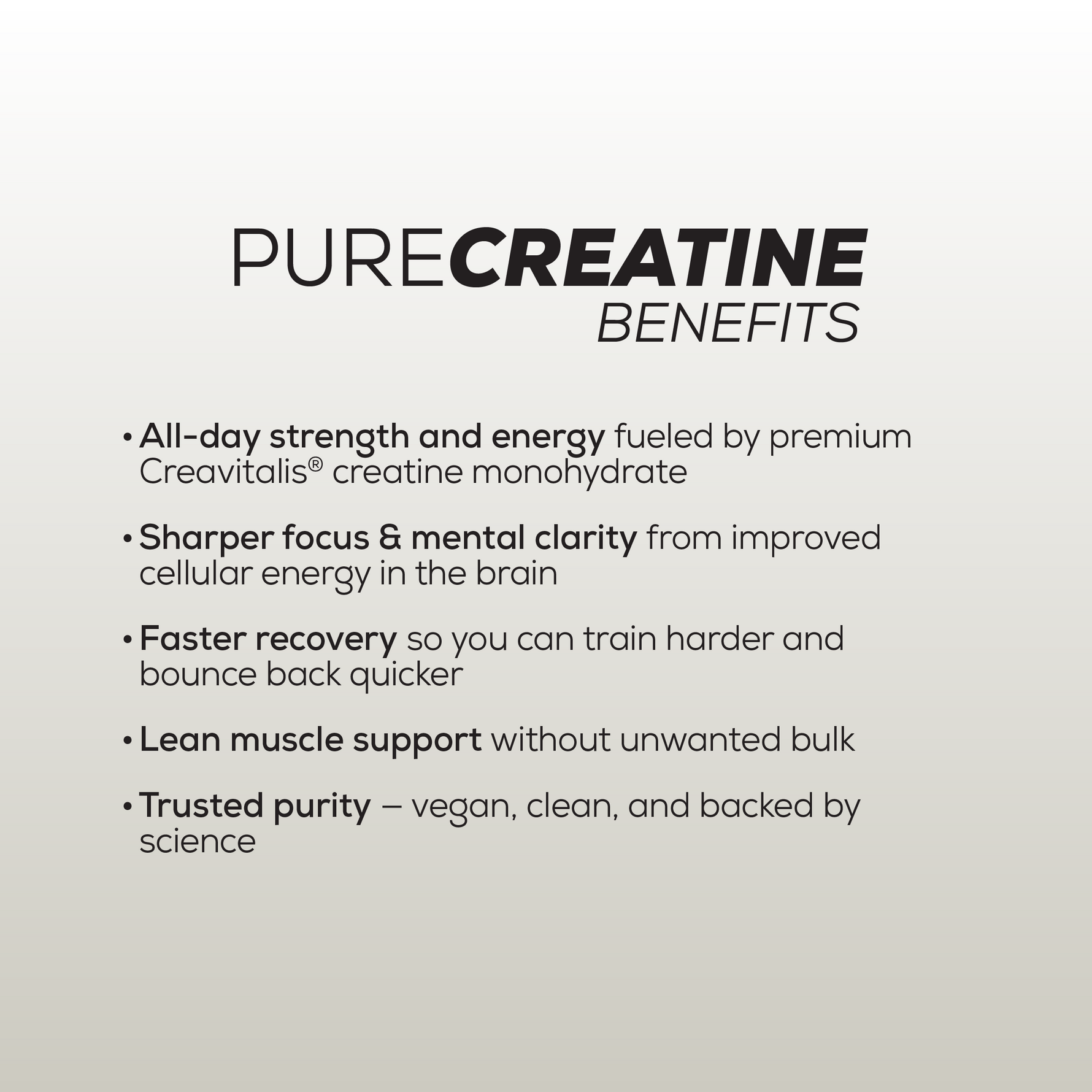 Not with PURE creatine like ours. Powered by Creavitalis®, it’s micronized for easy absorption - no grit, no bloat, just clean results.